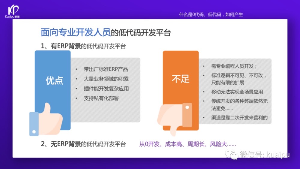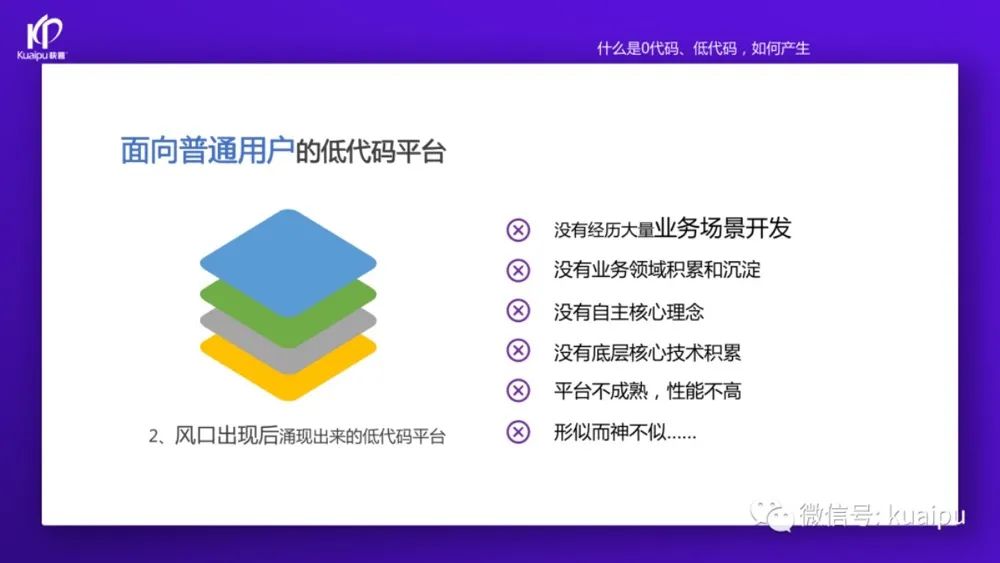 “這兩年快普已經(jīng)成功轉(zhuǎn)型為數(shù)字化平臺服務(wù)商,為客戶提供開發(fā)平臺和解決方案(產(chǎn)品)等服務(wù)。我們先從開發(fā)平臺說起,目前市場上的零代碼、低代碼平臺大致可以分為這幾類: