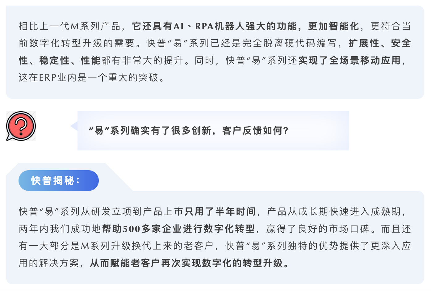 傳統(tǒng)的軟件開發(fā)需要很多經(jīng)驗豐富的編程人員,每個人的技術(shù)水平、寫法各不同,而易平臺可大大減少因人為編碼錯誤而引起的bug。平臺所有配置邏輯都是“開源”可視的,所有人員都看得懂產(chǎn)品的配置信息,問題定位也更快更準(zhǔn)確。此外,平臺還支持按明細(xì)生成升級腳本,bug修復(fù)和需求交付更高效。隨時能調(diào)整、發(fā)布、更新,也使得產(chǎn)品維護和升級更便捷,這些優(yōu)勢都進一步加強了產(chǎn)品的穩(wěn)定可靠。