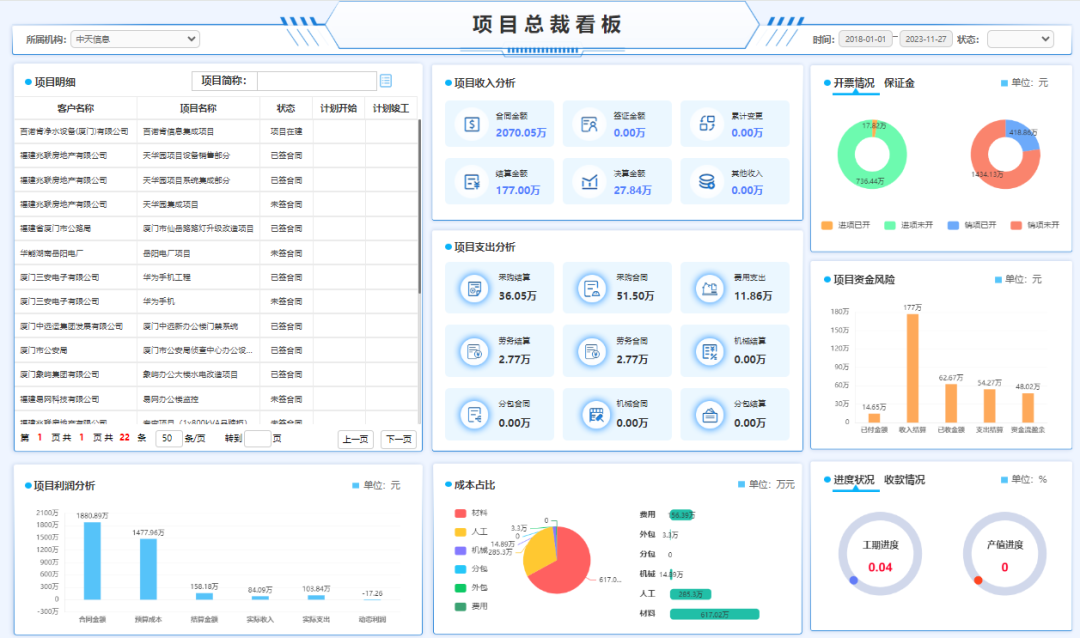 1、智慧決策體系:構建涵蓋項目毛利率、質保金狀態(tài)等項目關鍵指標的多維度數據看板,支持管理層與執(zhí)行層分級透視。